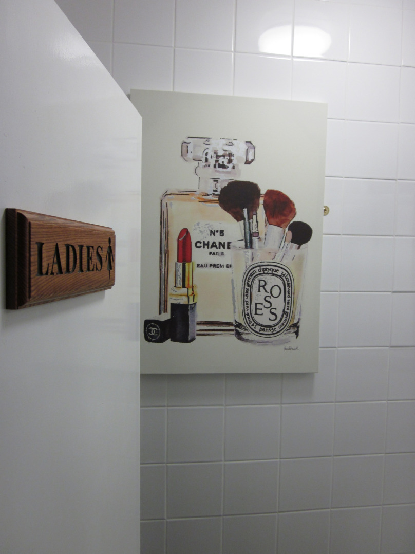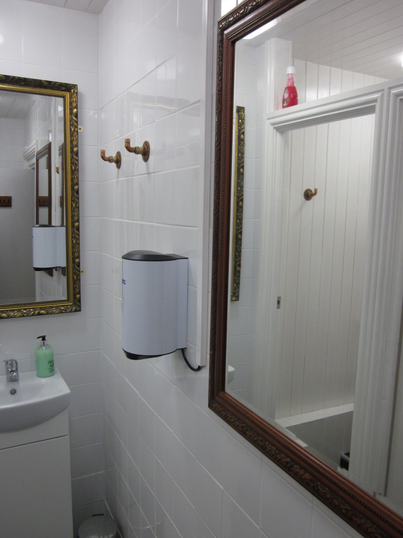 Then we have the Ladies facilities at the top of the first floor stairs. We have provided plenty of hooks for coats and handbags (we listen !). Two loos and one hand basin, but plenty of mirrors and a shelf to be added under the side mirror for your makeup if touching up.
