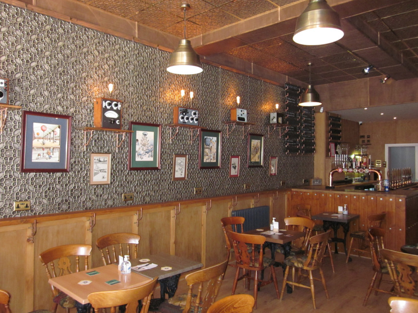 A view of the decoration, Lincrusta heritage coverings applied to walls and ceiling, modified old electrical test equipment made into table lamps sit on shelves around the walls along with LED Edison type bulbs that give a warm homely glow.